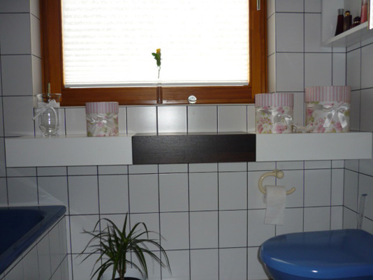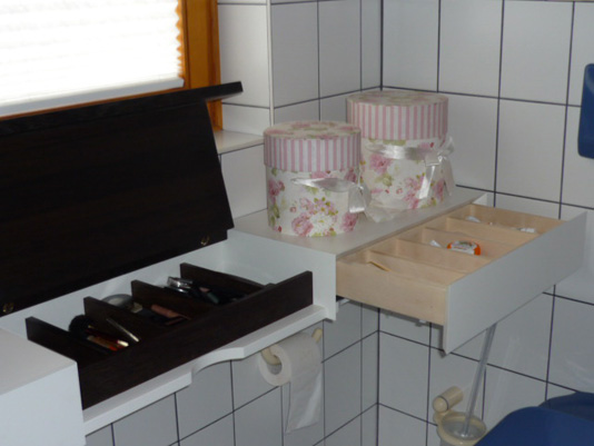 Badmöbel weiß lackiert mit einer Klappe aus Wenge