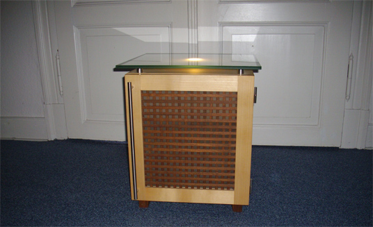 Nachtschrank aus Ahorn mit Glasplatte und Türgitter aus Nussbaum