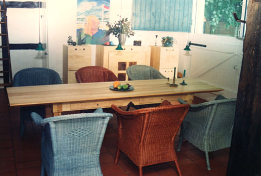 Esszimmer mit Tisch und drei Kommoden aus Esche und Nussbaum